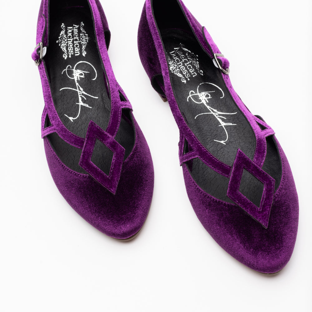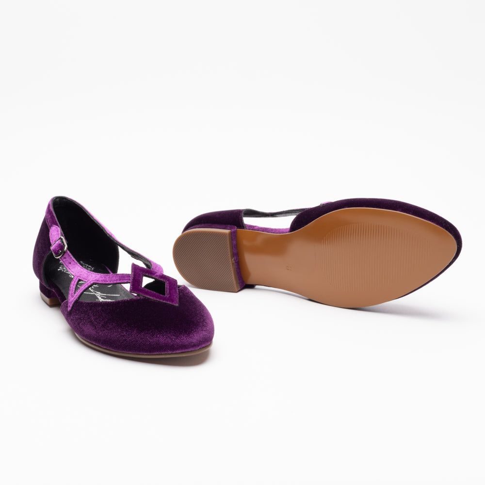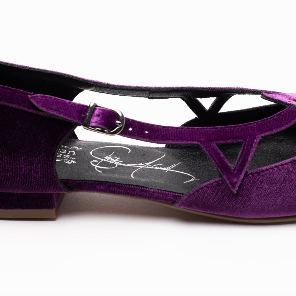 Step into a vintage-inspired fantasy with the Mildred Flats, from our collaboration collection with artist Christine McConnell! Inspired by 1950s 'flatties', these flats are unlike any you've seen before. Uppers in rich, luxe velvet, open sides, and strappy details festooned with geometric motifs make Mildred unique. Mildred features our dependable 0.5"/ 1.27 cm common sense heel, which is low and sturdy for all-day comfort. These shoes are festive, leather-free, and come in five gorgeous colorways.