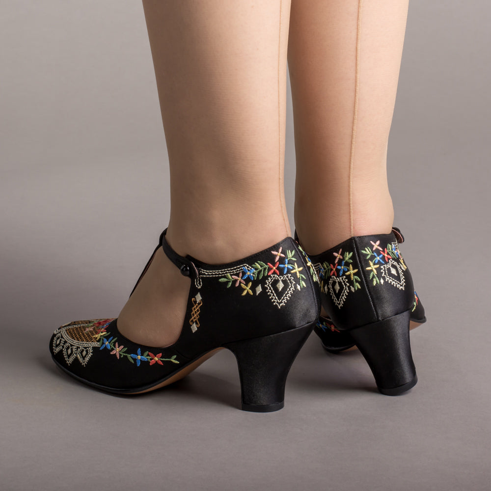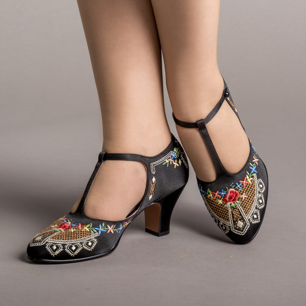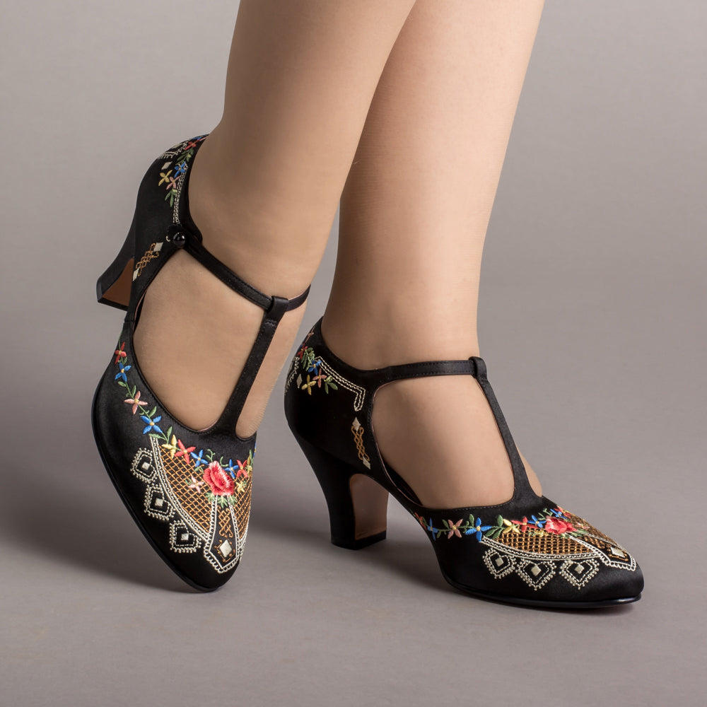 As hemlines rose in the 1920s, flashy footwear was all the rage, and the Daisy Embroidered T-Strap heels are just the ticket. Made in luminous satin heavily embroidered in a gorgeous botanical design, the Daisy T-Strap Shoes are closely based on an original pair in Bata Shoe Museum. These gorgeous shoes are accurate for the 1920s, 1930s, and 1940s, and offer our refined and stable 2.5 in / 6.3 cm Spanish heel paired with open sides and an almond toe.