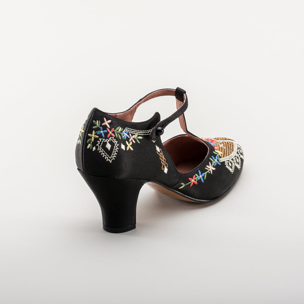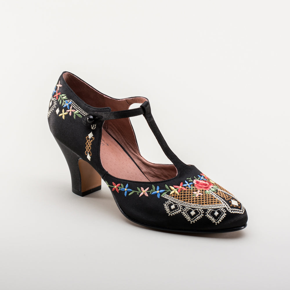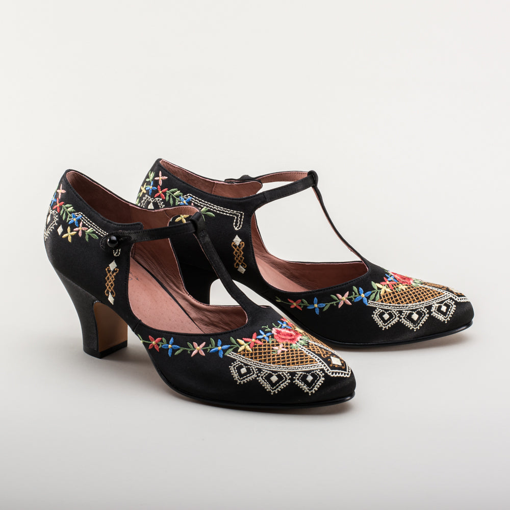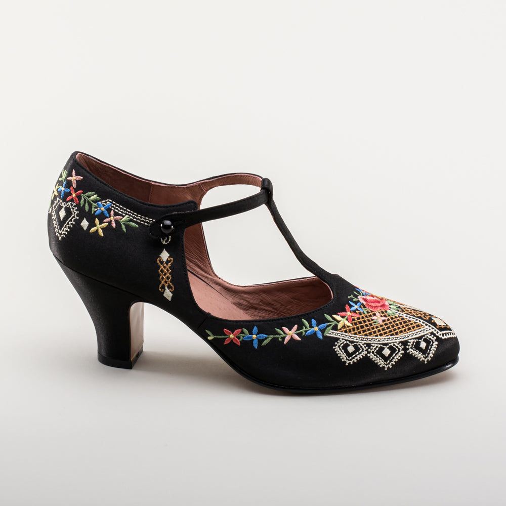 As hemlines rose in the 1920s, flashy footwear was all the rage, and the Daisy Embroidered T-Strap heels are just the ticket. Made in luminous satin heavily embroidered in a gorgeous botanical design, the Daisy T-Strap Shoes are closely based on an original pair in Bata Shoe Museum. These gorgeous shoes are accurate for the 1920s, 1930s, and 1940s, and offer our refined and stable 2.5 in / 6.3 cm Spanish heel paired with open sides and an almond toe.