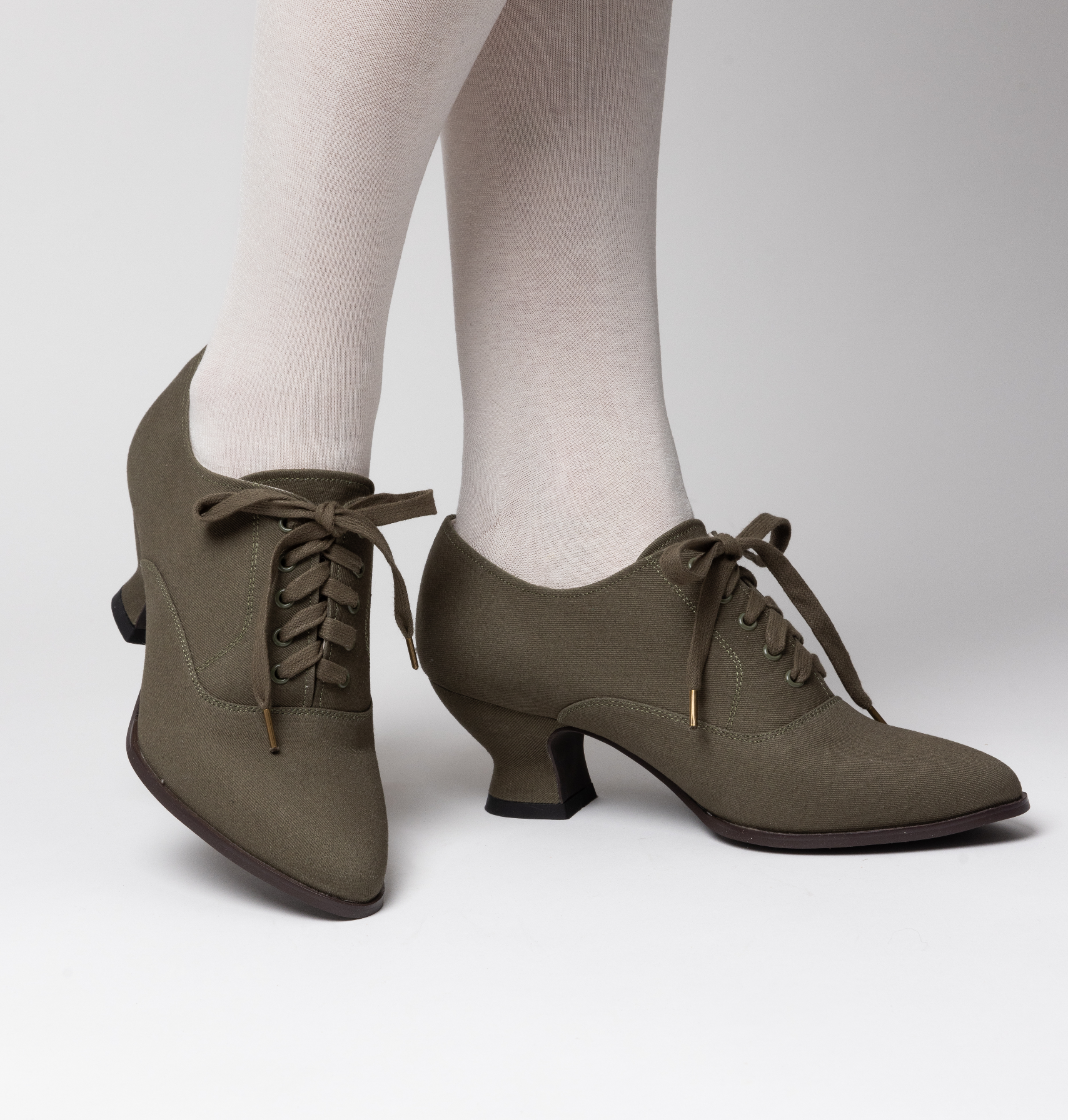 Meet the Kedwardians, the perfect light and breezy sporting shoes from the turn of the 20th century. Based on many original examples of early ladies' tennis shoes, the Kedwardians are made inside and out in cotton canvas paired with practical rubber soles and a stable and comfortable 2 in / 5 cm French heel. These Edwardian tennis shoes are leather-free, lightweight, easy to clean, and extremely comfortable.