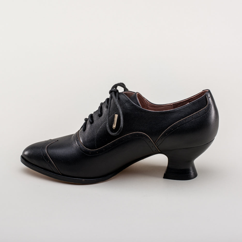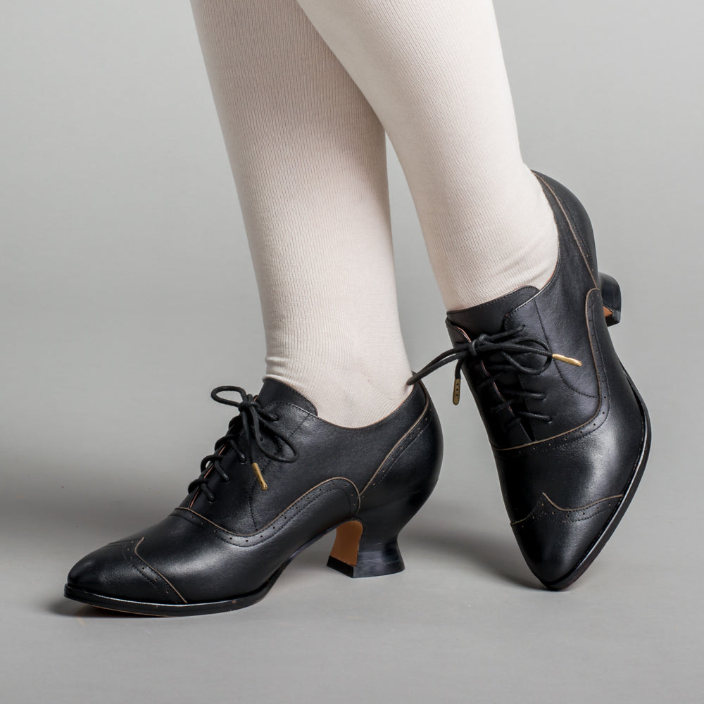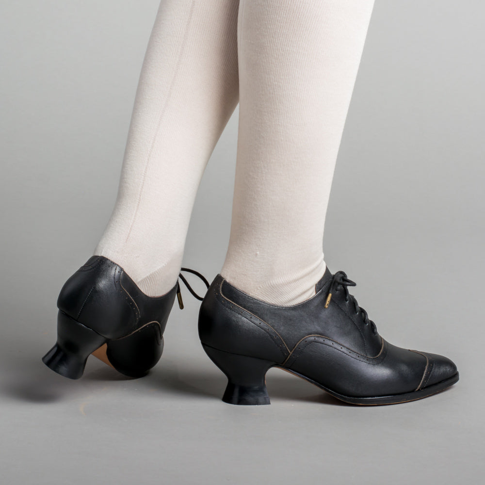 Whether you are fighting for the right to vote or exercising that right today, the Londoner Edwardian Oxfords will keep you on your feet, on the go, comfortably, and chic all day long. Made of real leather with leather lining and soles, these beautiful reproduction Edwardian oxford shoes feature an adjustable lace-up closure, eyecatching broguing on the uppers, and a stacked-look French heel. Paired with walking skirts of the 1910s or wide-legged trousers of the 2020s, the timeless Londoner oxfords are an excellent choice.