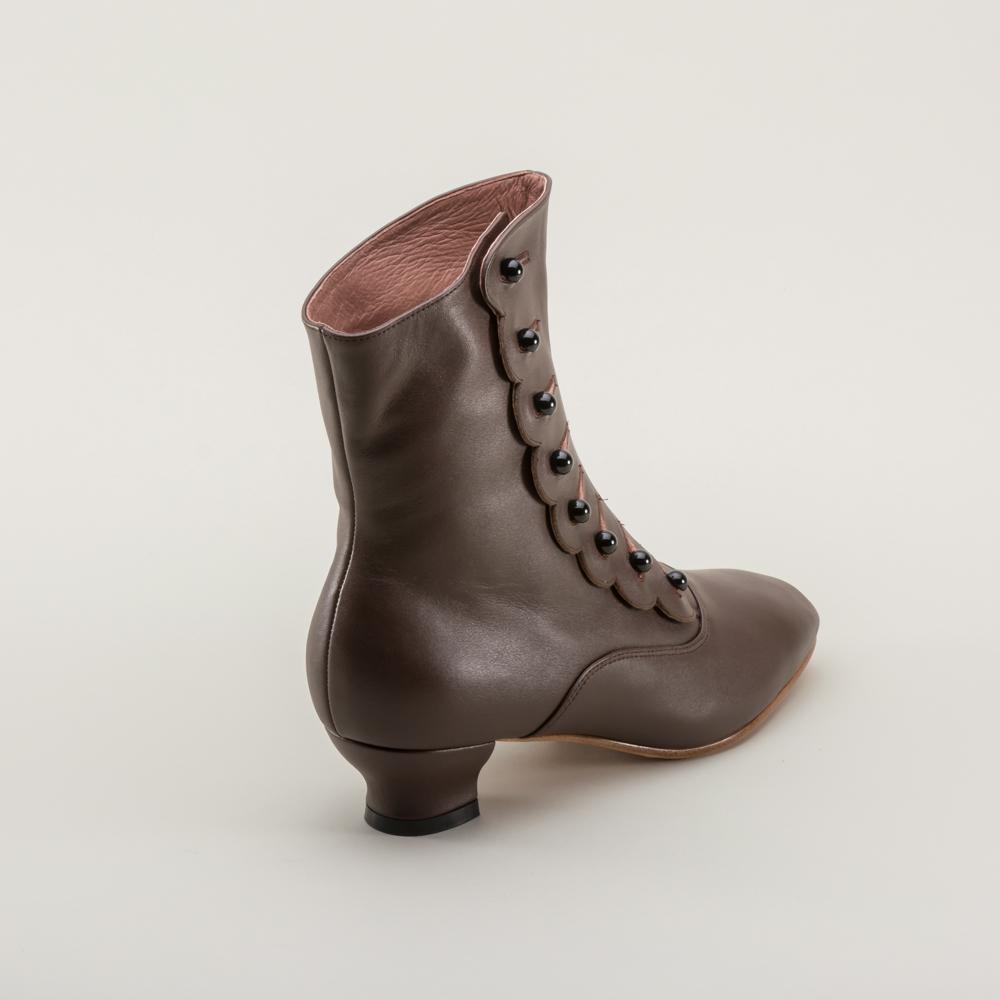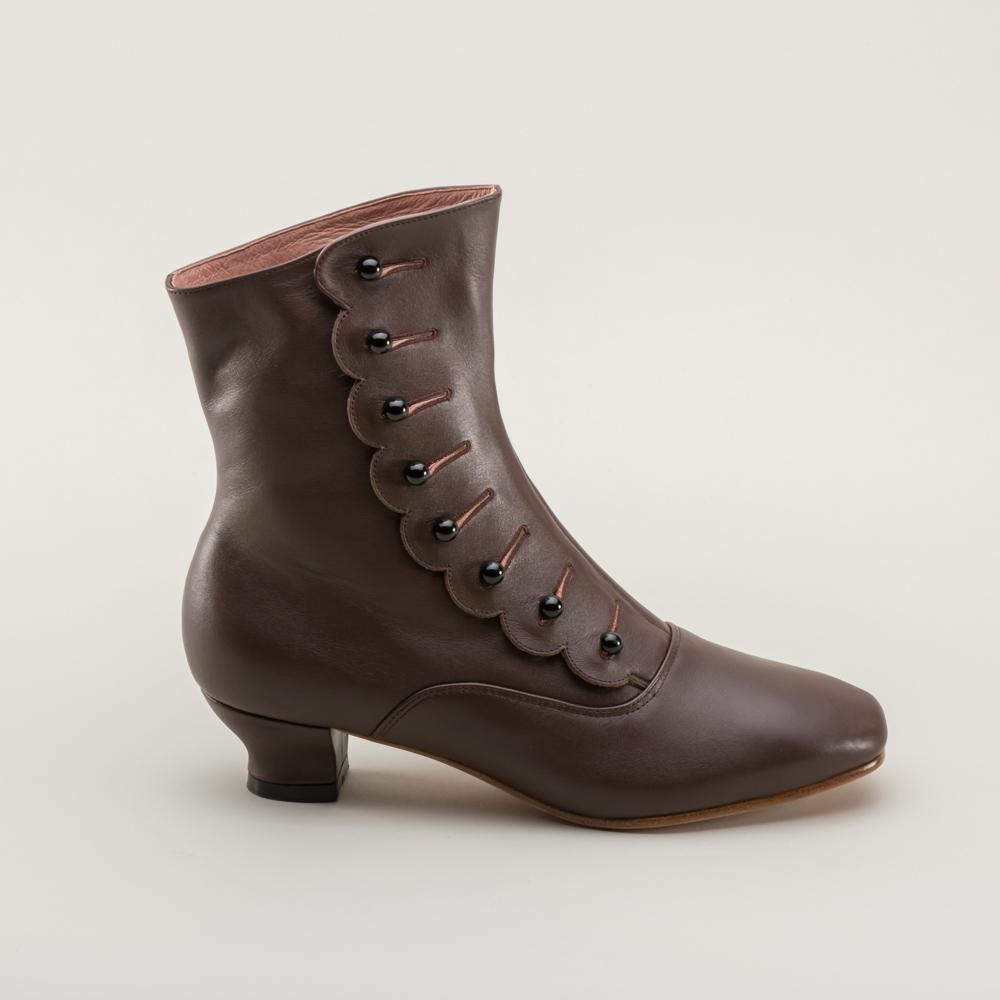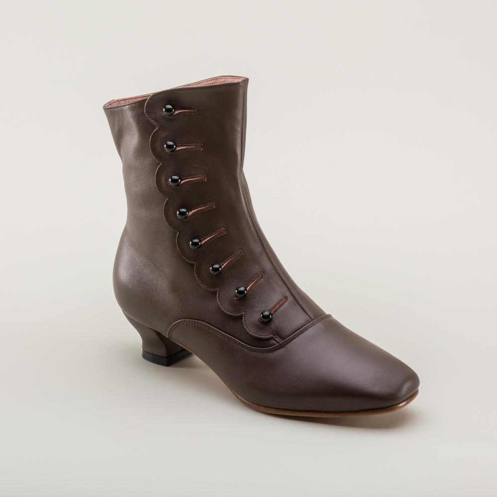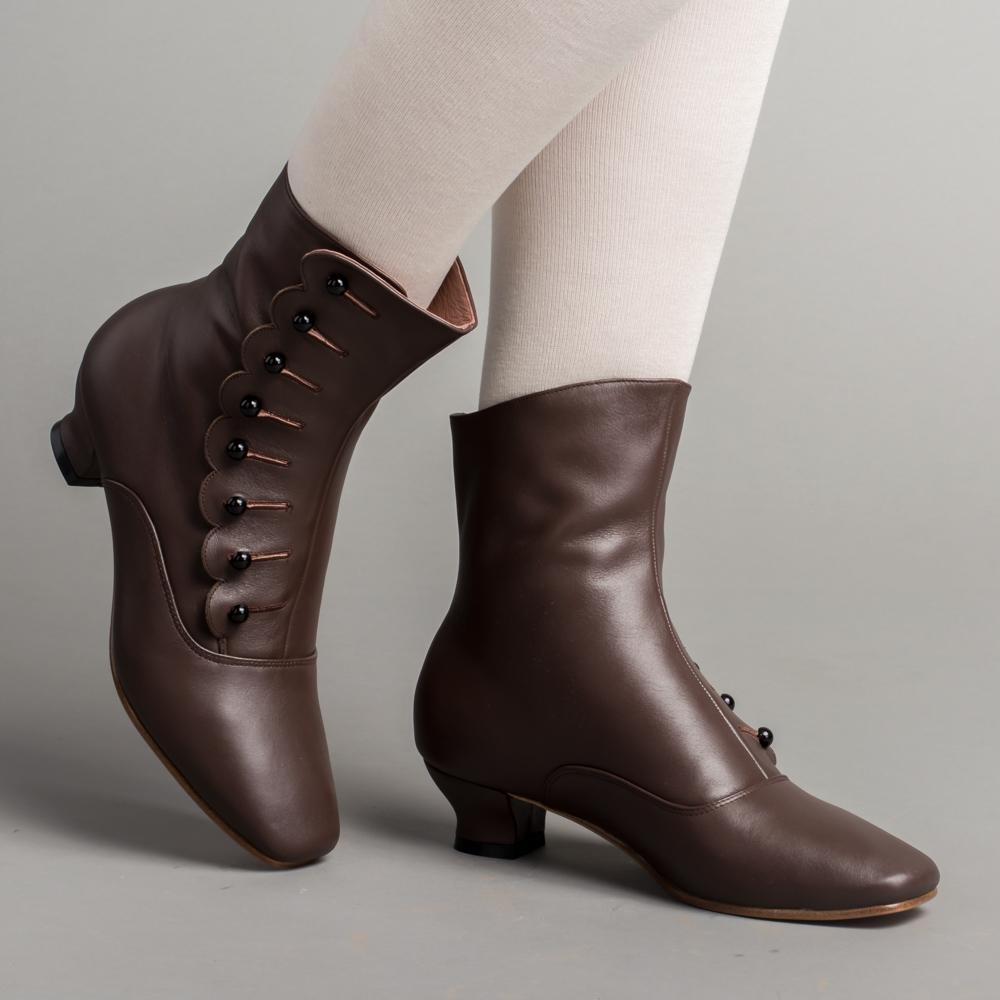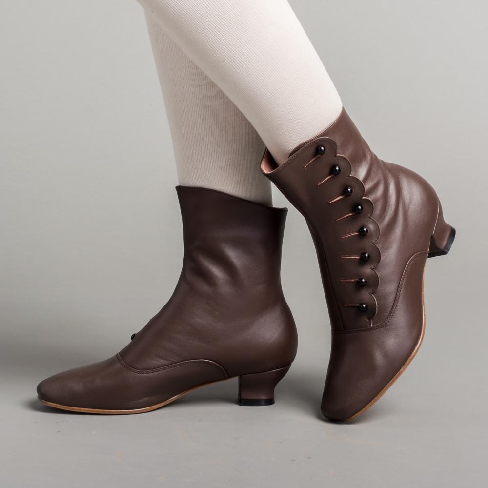 These mid-Victorian and Bustle Era boots have square toes, a short heel molded from an original, and an attractive scalloped edge and top, making them practical yet feminine, and ideal for a fashionable Victorian lady.