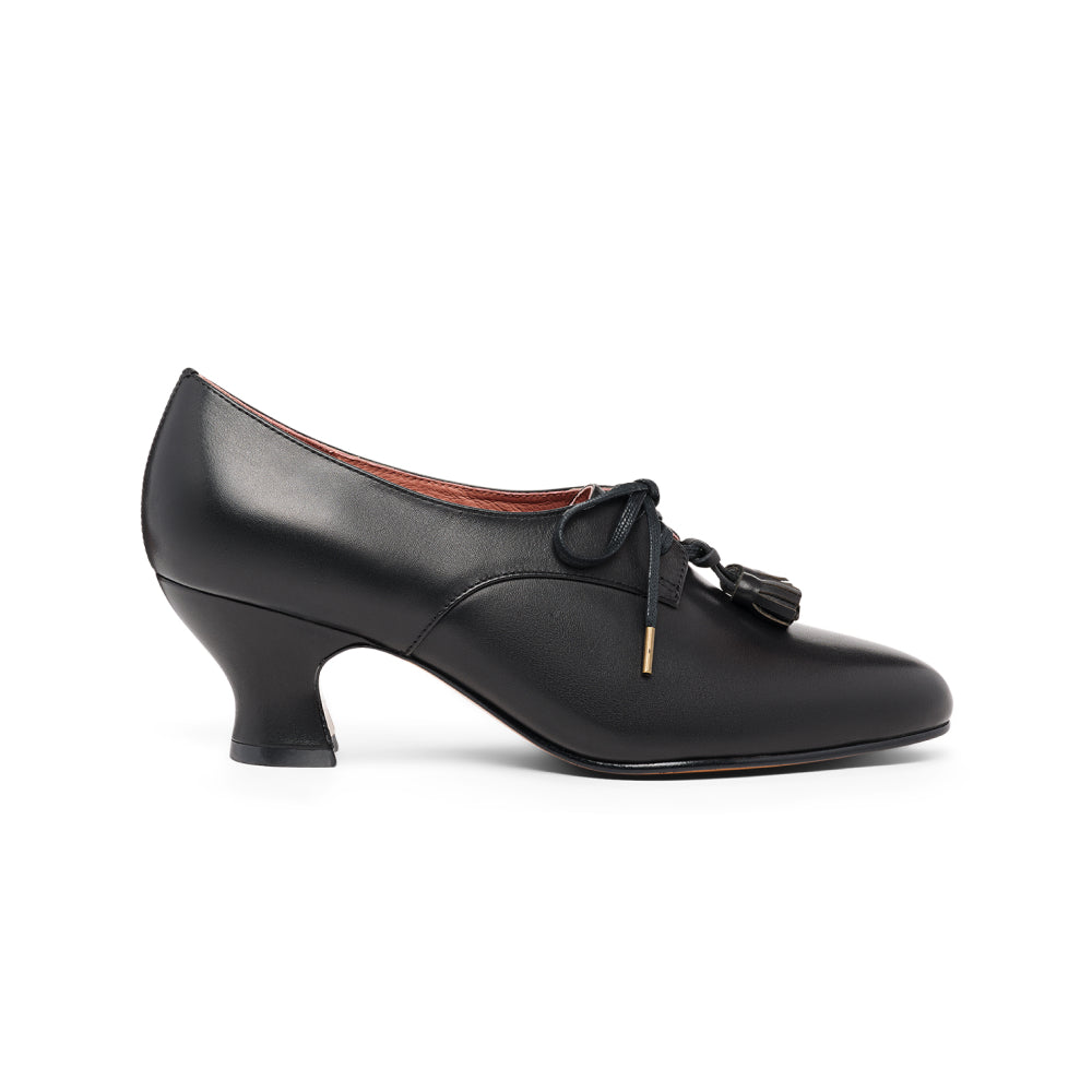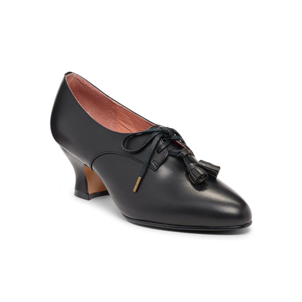 Cordelia is the versatile and attractive Edwardian Oxford everyone needs in their wardrobe. These beautifully crafted shoes are carefully reproduced from period originals, and feature a historical silhouette, lace-up closures, and removable decorative tassels. Cordelia is built on our custom, perfectly balanced, 2"/5.08 cm French spool heel, so you can walk comfortably in style. Available in a selection of neutral-colored leathers, Cordelia blends seamlessly into the leg line for a sleek and sophisticated look that goes with any ensemble. Cordelia comes in both standard and wide widths.