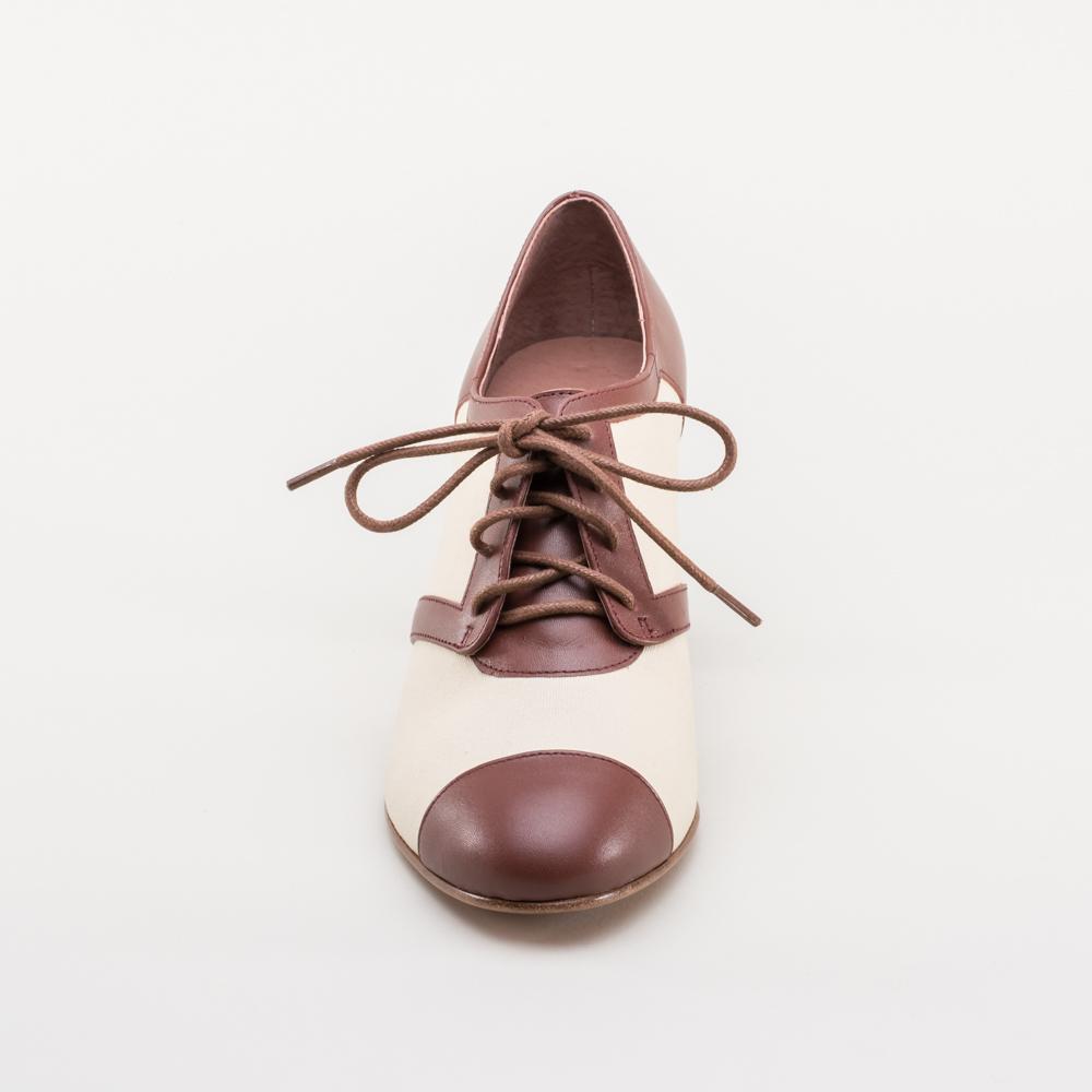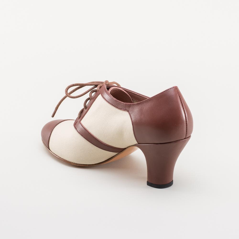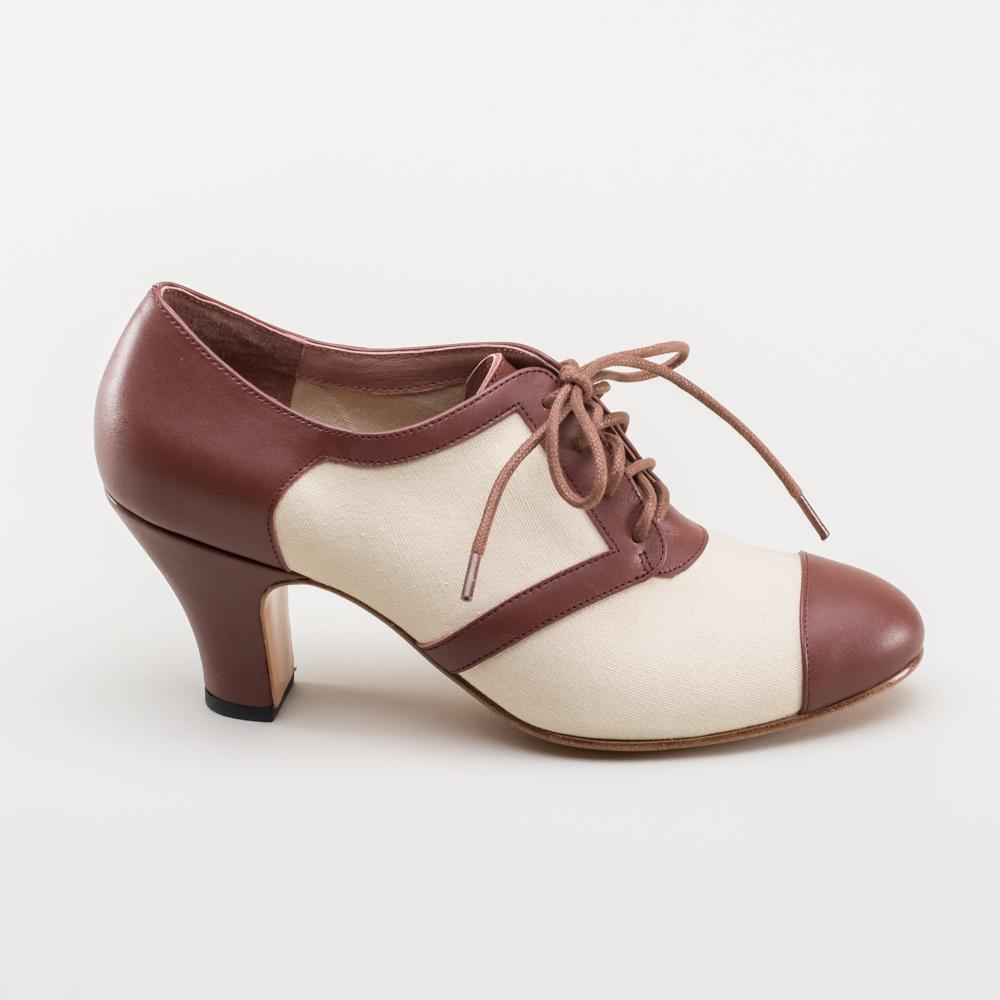 How better to complete a 1920s or 1930s sporty ensemble than with a perfect pair of Evelyn oxfords? These retro spectator oxfords are made of tan canvas combined with a rich brown leather on a 2 3/8" / 6 cm Spanish heel and insole arch support.