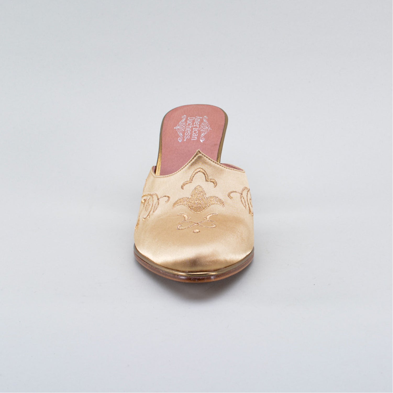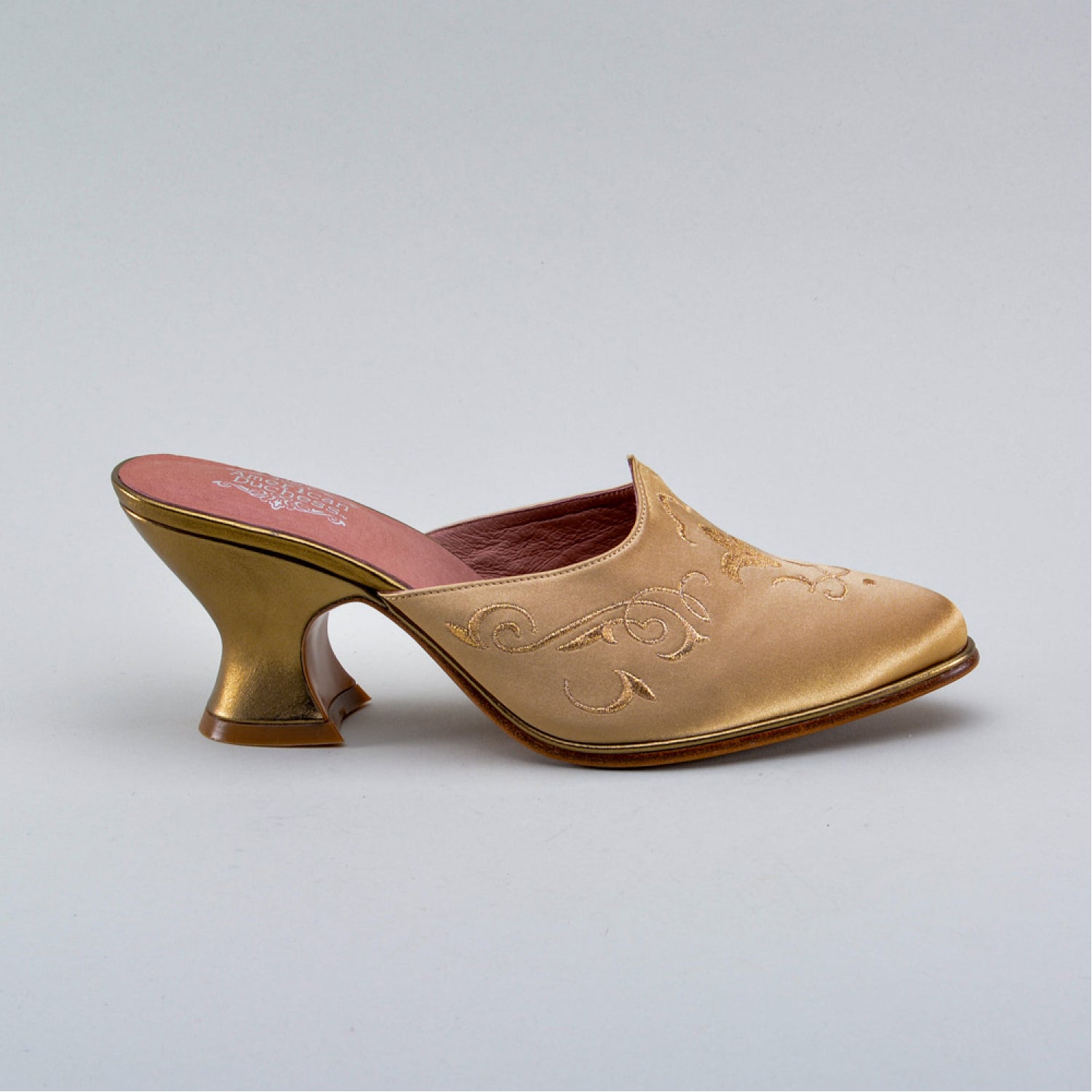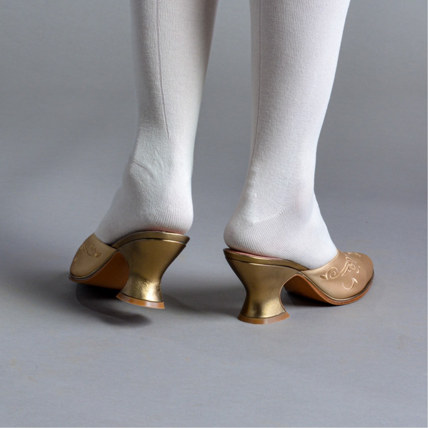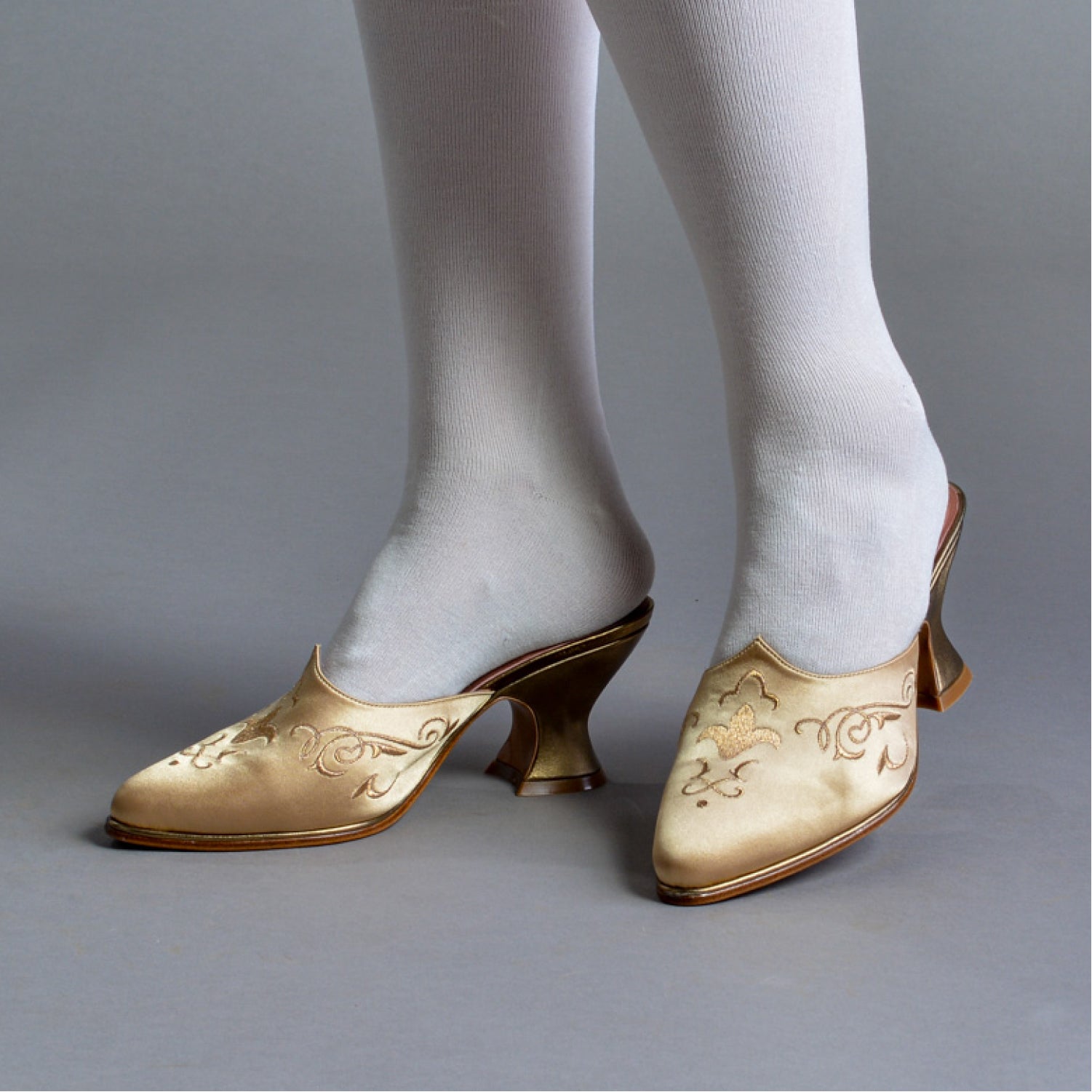 Charlotte 18th century mules blend history and fantasy in an opulent and sophisticated 18th century satin mule. Correct for c. 1700 - 1770s, these elegant backless heeled slippers feature a superbly balanced gold French heel, leather lining for easy walking, and a softly pointed toe. Pair Charlotte with your best Georgian gown, or with your everyday wardrobe to add a touch of luxury!