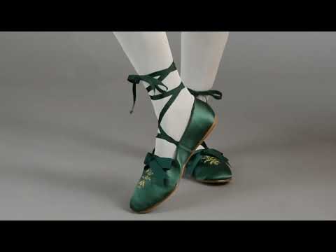 These slip-on shoes are accurate for c. 1800 - 1830. They feature a beautiful satin upper embroidered with a historical design on the vamp, complete with spangles. The edges are bound in petersham, with matching optional ankle ribbons and vamp bow which is easily removed. Period-correct turnshoe construction, soft square toe, and real leather soles make the Penelopes unmatched for evening and formal events where the prettiest of shoes are required. Wear them for Jane Austen, Napoleonic, War of 1812, and all Regency events.